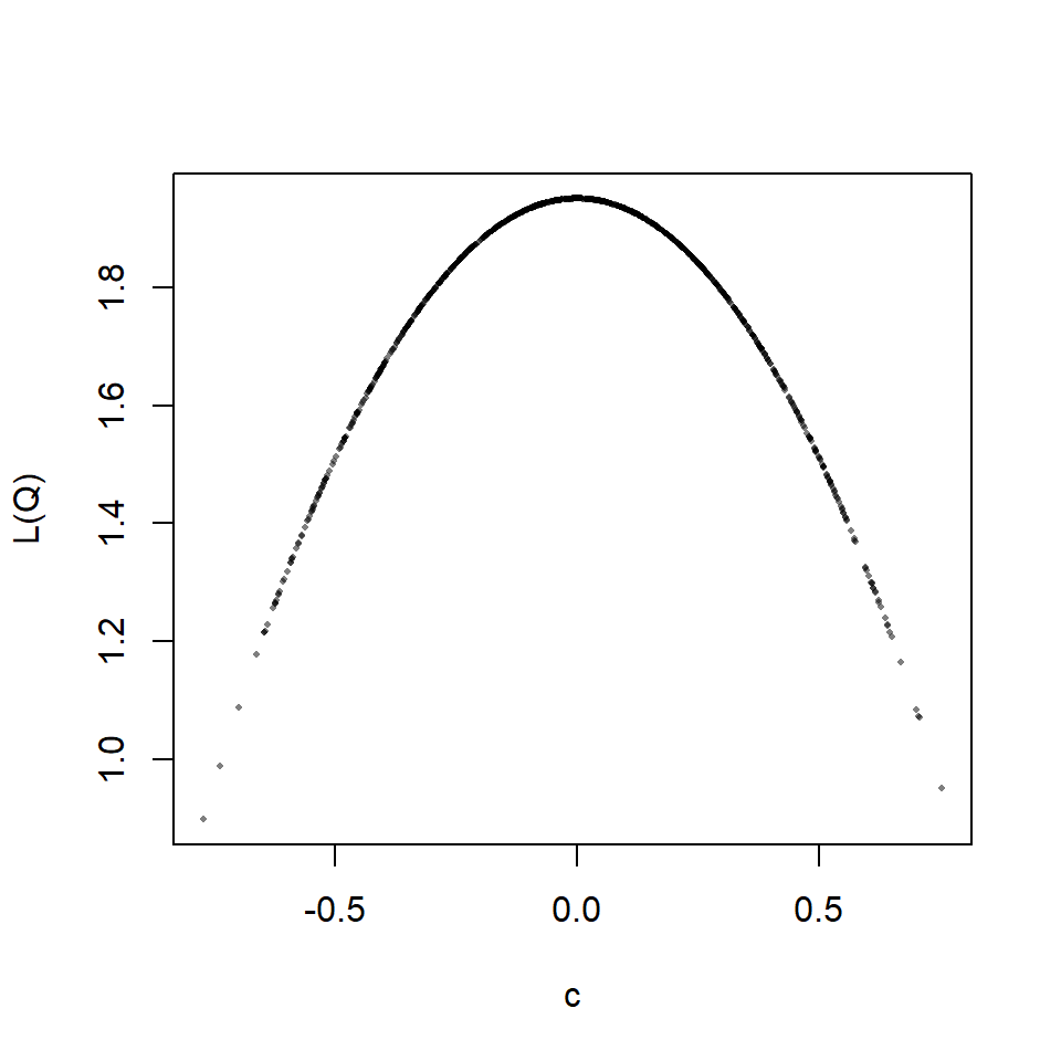 plot(x$s, x$rss, pch=16, cex=.4, xlab="c", ylab="L(Q)", col="#00000010")Below you find some more graphics with different matrices as inputs.